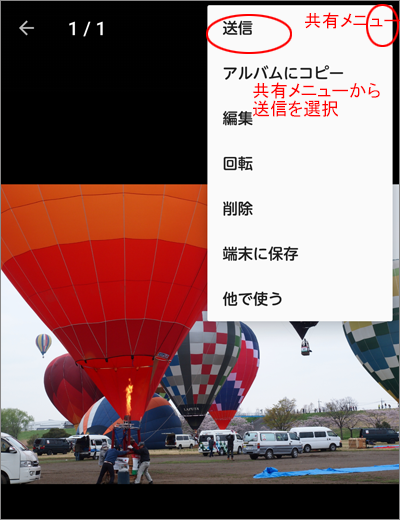 アルバムアプリ(機種により異なる)にて送信対象の画像を表示します。