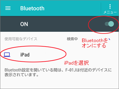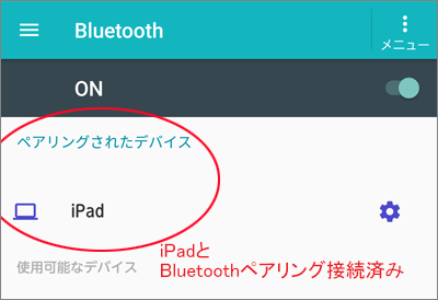 ※使用可能なデバイス(例では iPad)は、タブレット側のBluetoothがオンになった後に表示されます。