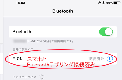 これでスマホ側(Android系)とタブレット側(iOS系)のブルートゥース・テザリング設定操作は終了です。