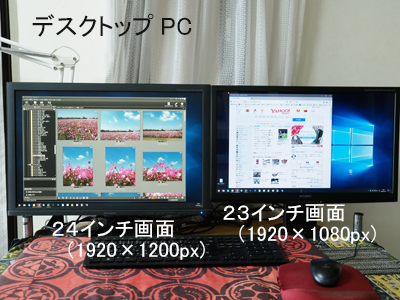 デスクトップPCでは、24インチ画面(解像度 1920×1200px) + 23インチ画面(解像度 1920×1080px)の2台をデュアルディスプレイで使用しています。
