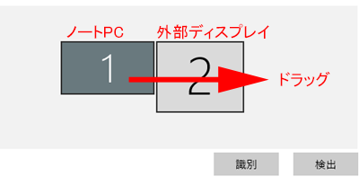 変更方法は、配置図の「1」(例ではノートPC)をドラッグし、外部ディスプレイの右側に移動します。