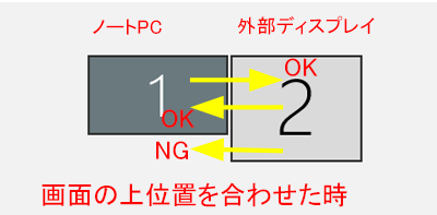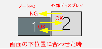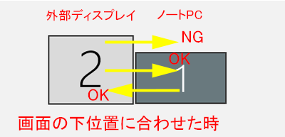 この例では2画面の上位置を合わせているため、下位置にマウスポインターの移動できない場所ができ、外部ディスプレイの左側下部からPC側へは移動できません。